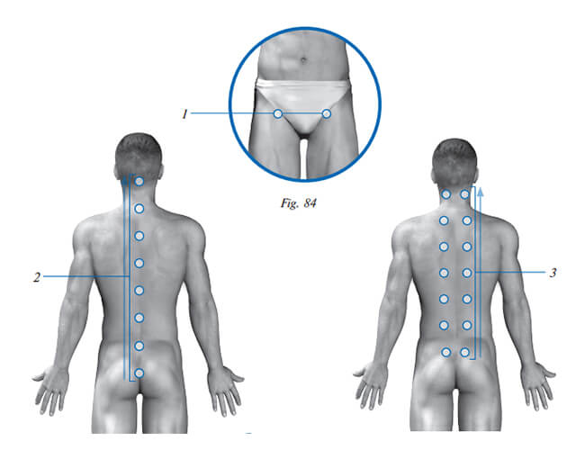 Exposure AreaAlong the spine on the right and on the left, bottom to top along spinal extensor muscles at 10 cm interval